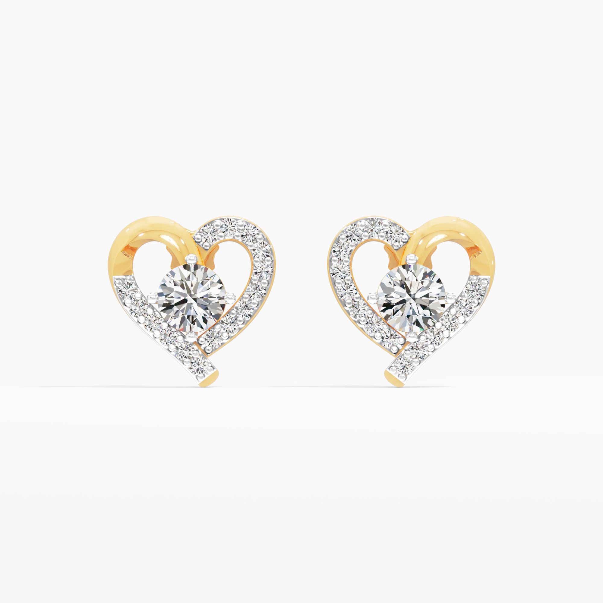 Modern studs featuring a round lab-grown diamond, nestled between two asymmetric flowing arcs of metal and round stones that meet to create a distinct, open heart shape.