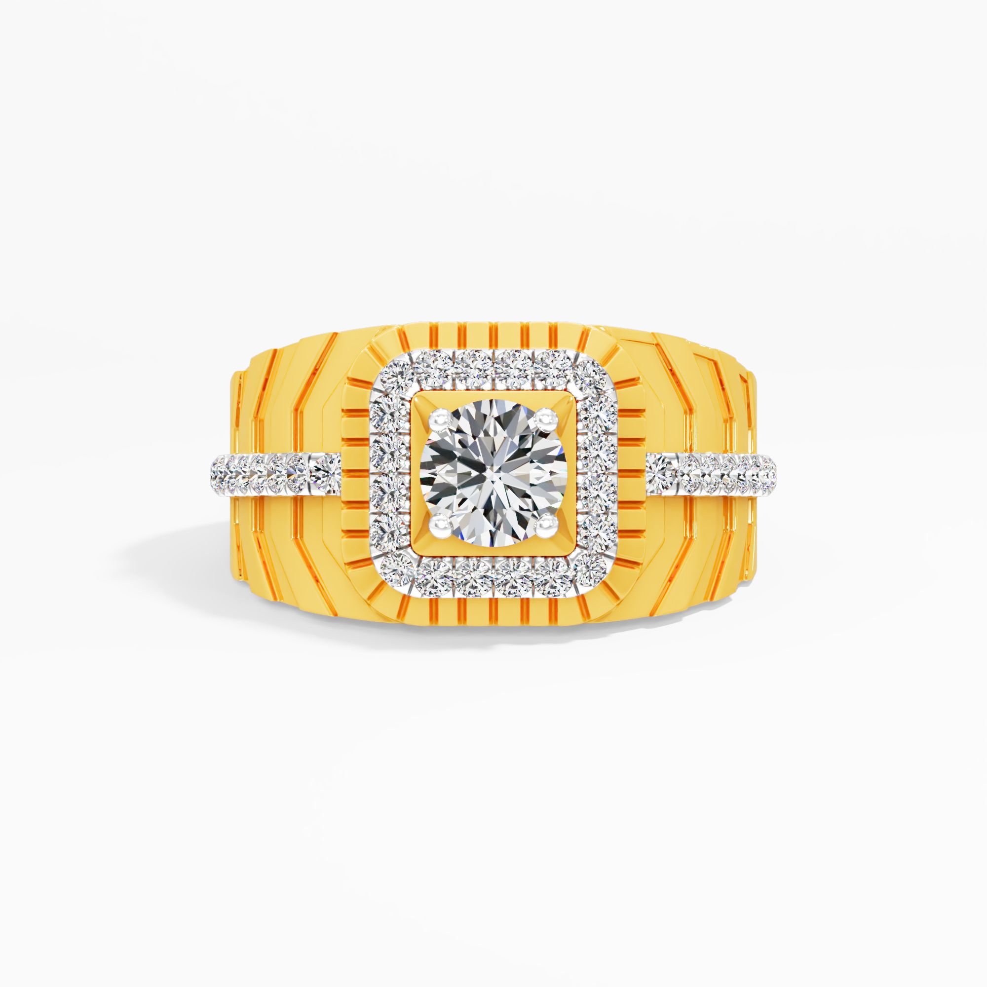 A central round stone commands attention within a square halo of round diamonds. The wide band features deep ridges and diamond accents, creating a powerful and enduring masculine ... Read More
