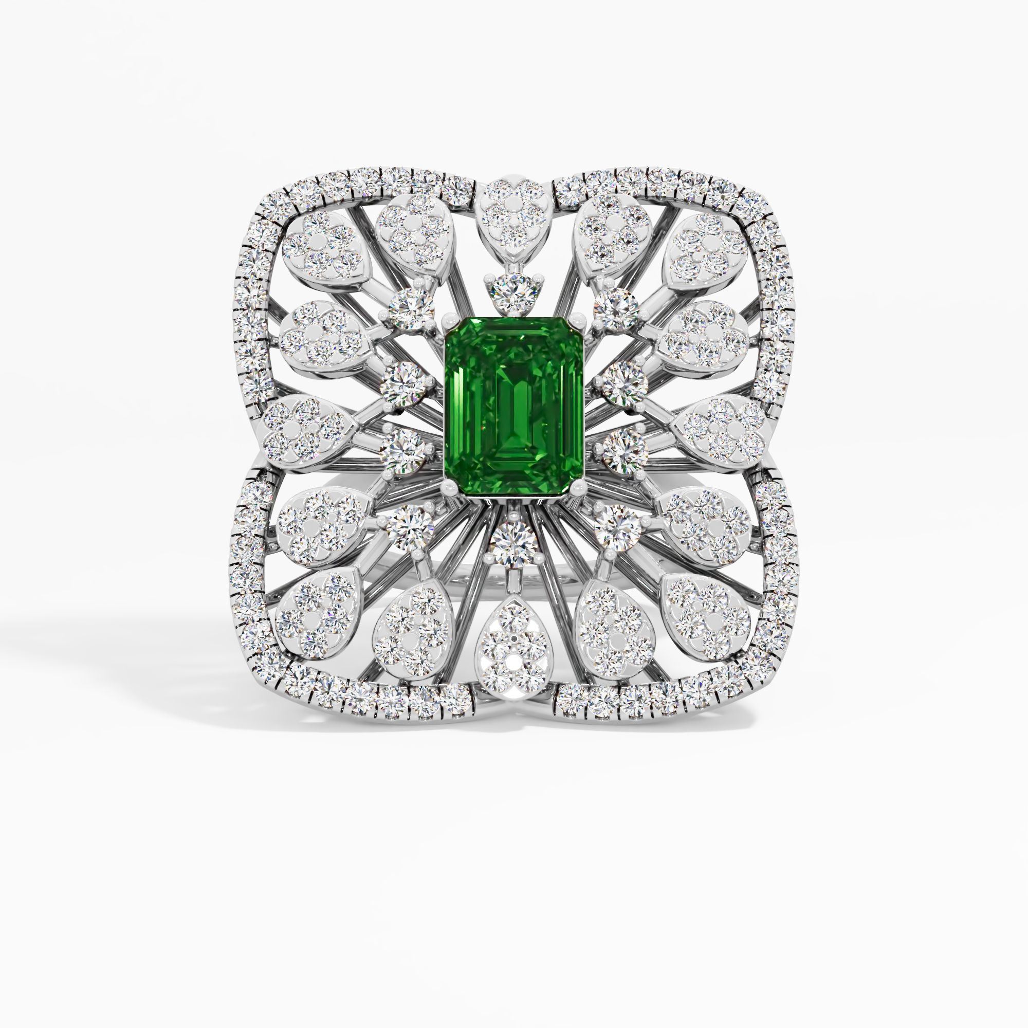 A green emerald-cut center gemstone sits amidst an intricate round diamonds lace pattern. Pear-shaped petals and a square halo create a stunning openwork design for a bold, luxurio... Read More