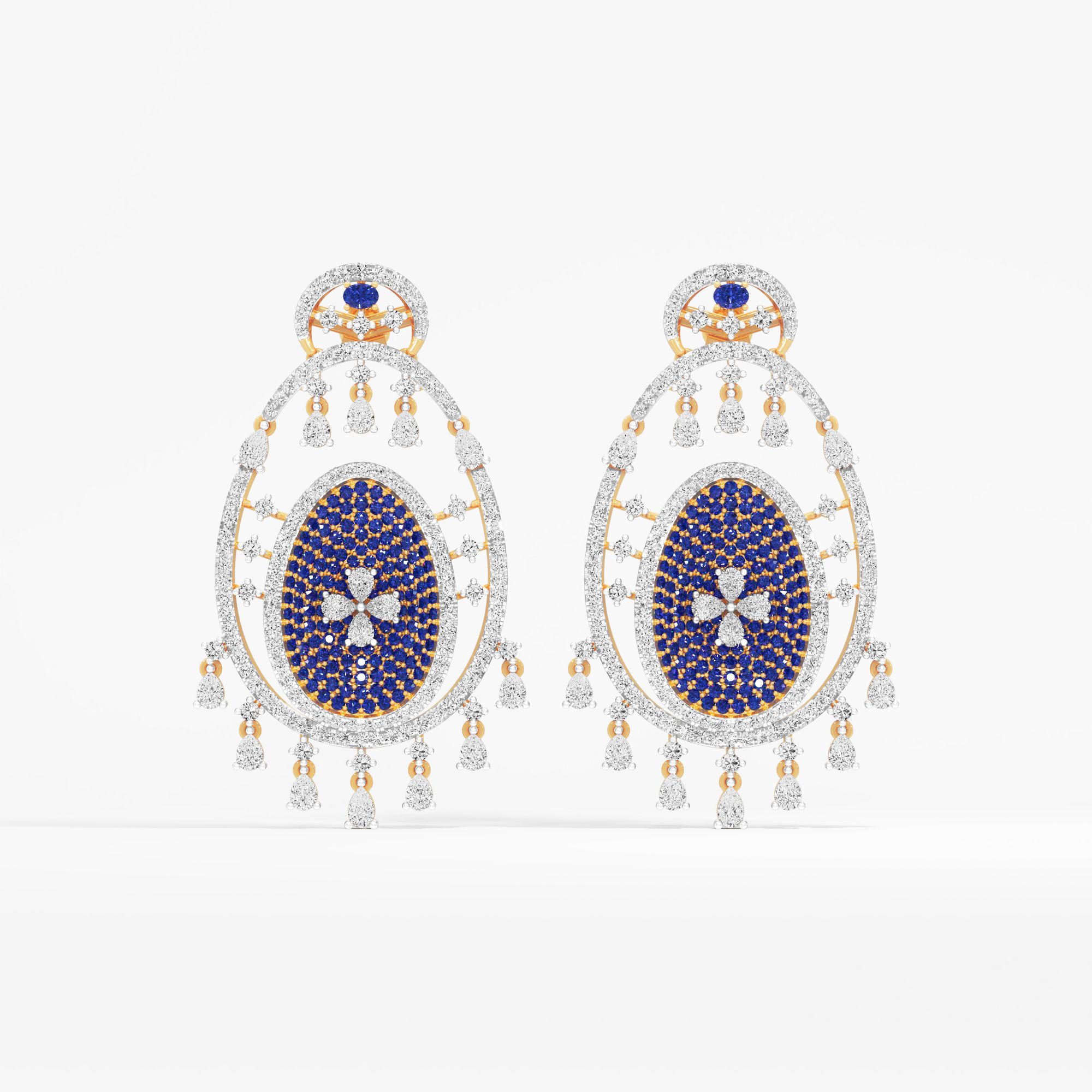 Capturing the mystery of an eternal night, these ornate dangle earrings feature a shimmering oval motif of round and pear lab-grown diamonds, beautifully centered by vibrant blue g... Read More