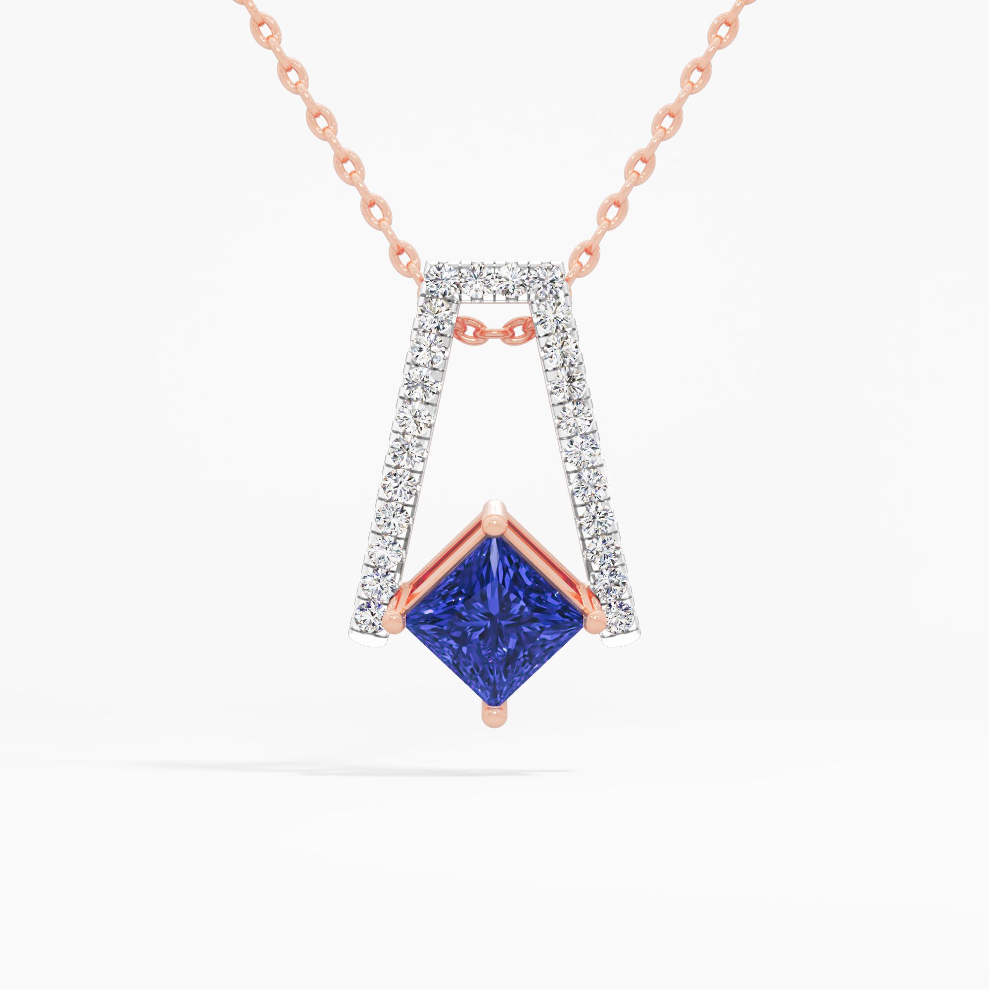 Striking pendant featuring a suspended princess-shaped sapphire, complemented by an open pavé round diamond structure that creates a floating visual effect with sharp lines and con... Read More
