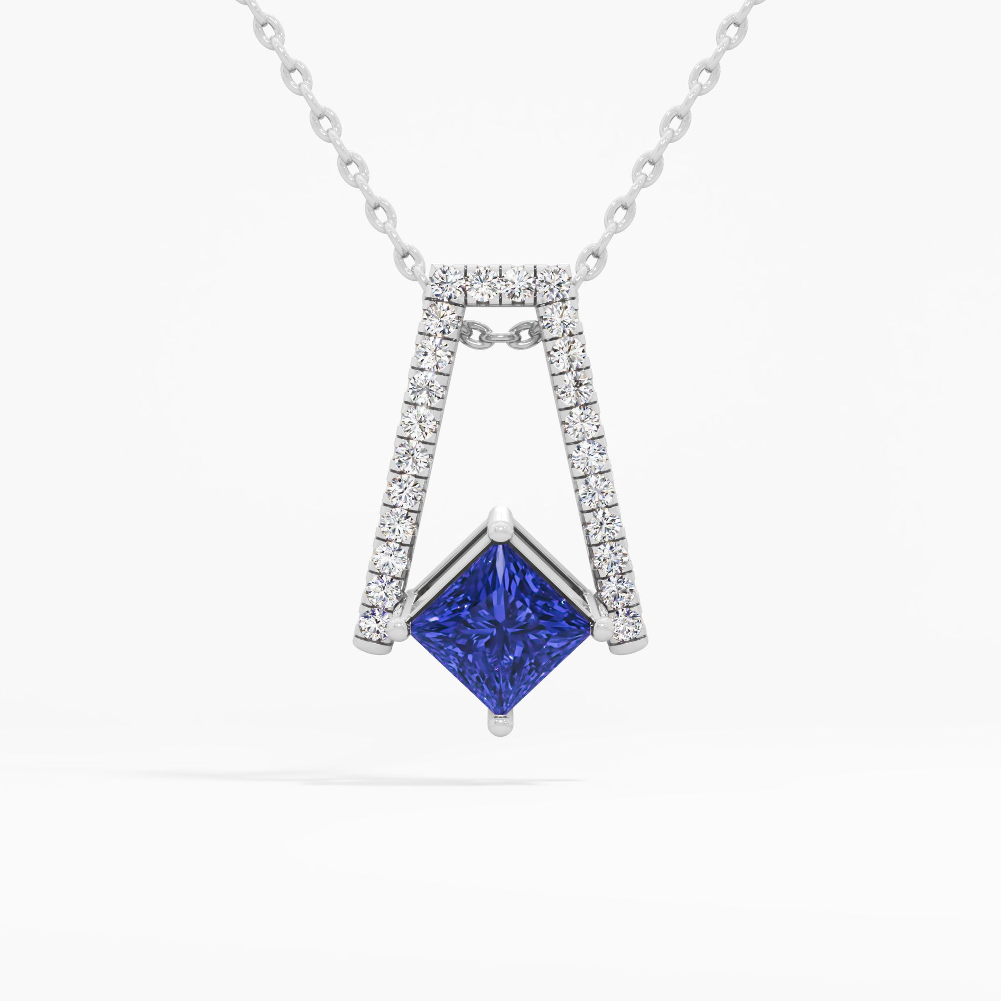 Striking pendant featuring a suspended princess-shaped sapphire, complemented by an open pavé round diamond structure that creates a floating visual effect with sharp lines and con... Read More