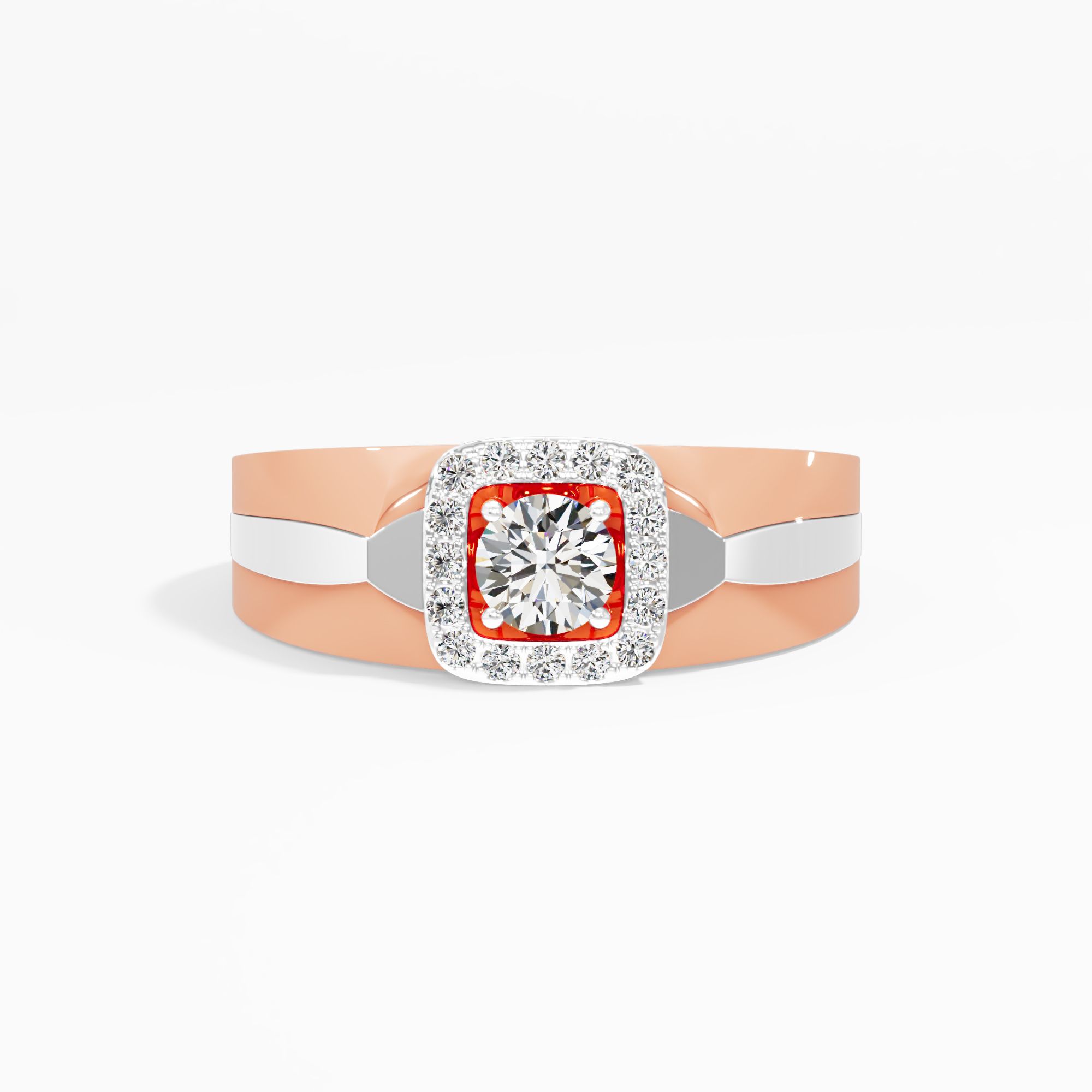 This majestic halo ring features a round lab grown diamond nestled within a cushion frame. Its wide, polished band represents the unbreakable strength and grace of your sanctuary.