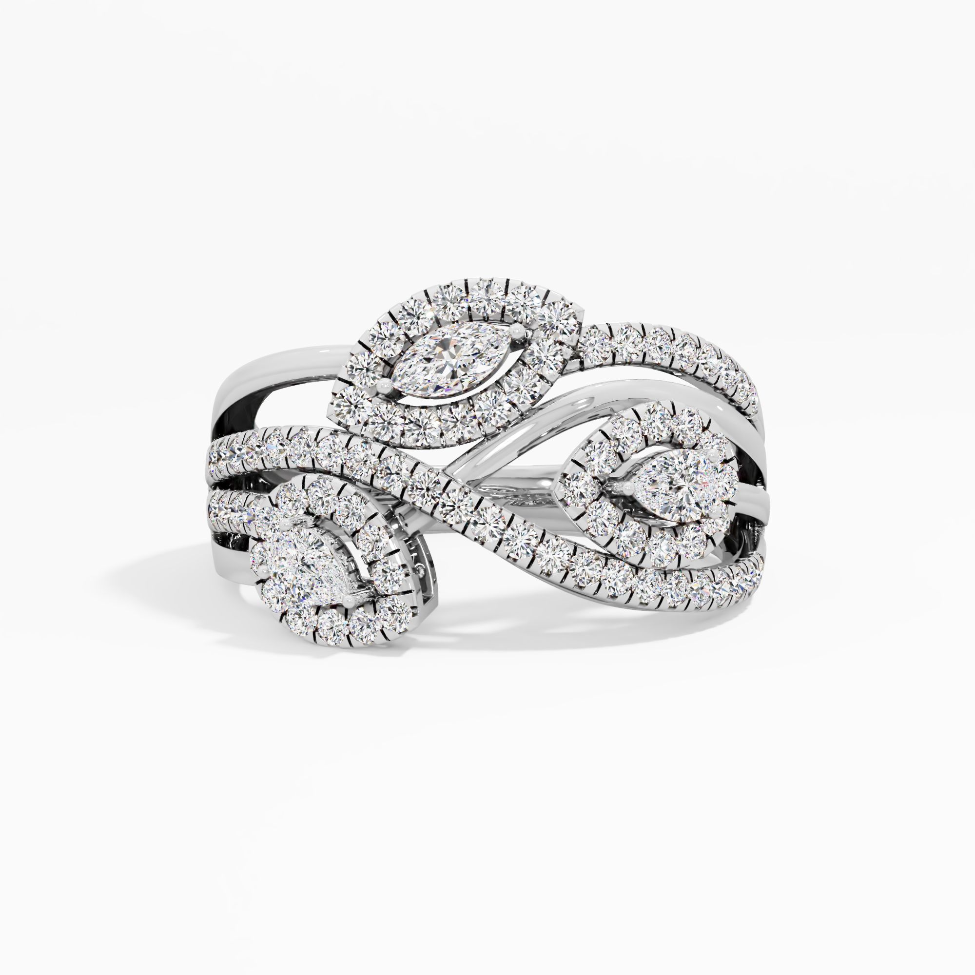Round, pear, and marquise diamonds unite in this floral design. The sweeping, diamond-lined bands add movement, creating a uniquely romantic and dazzling bouquet for her finger.