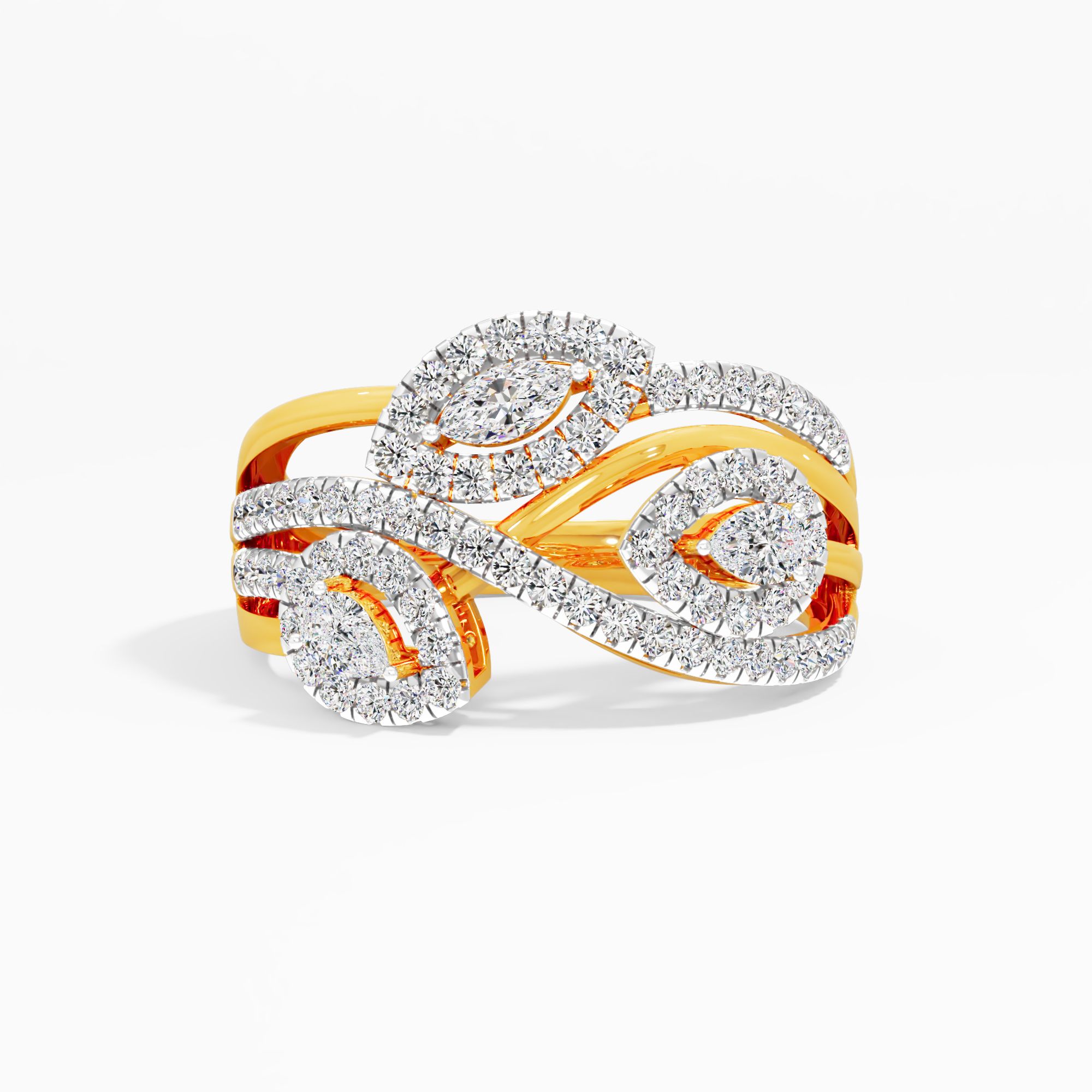 Round, pear, and marquise diamonds unite in this floral design. The sweeping, diamond-lined bands add movement, creating a uniquely romantic and dazzling bouquet for her finger.