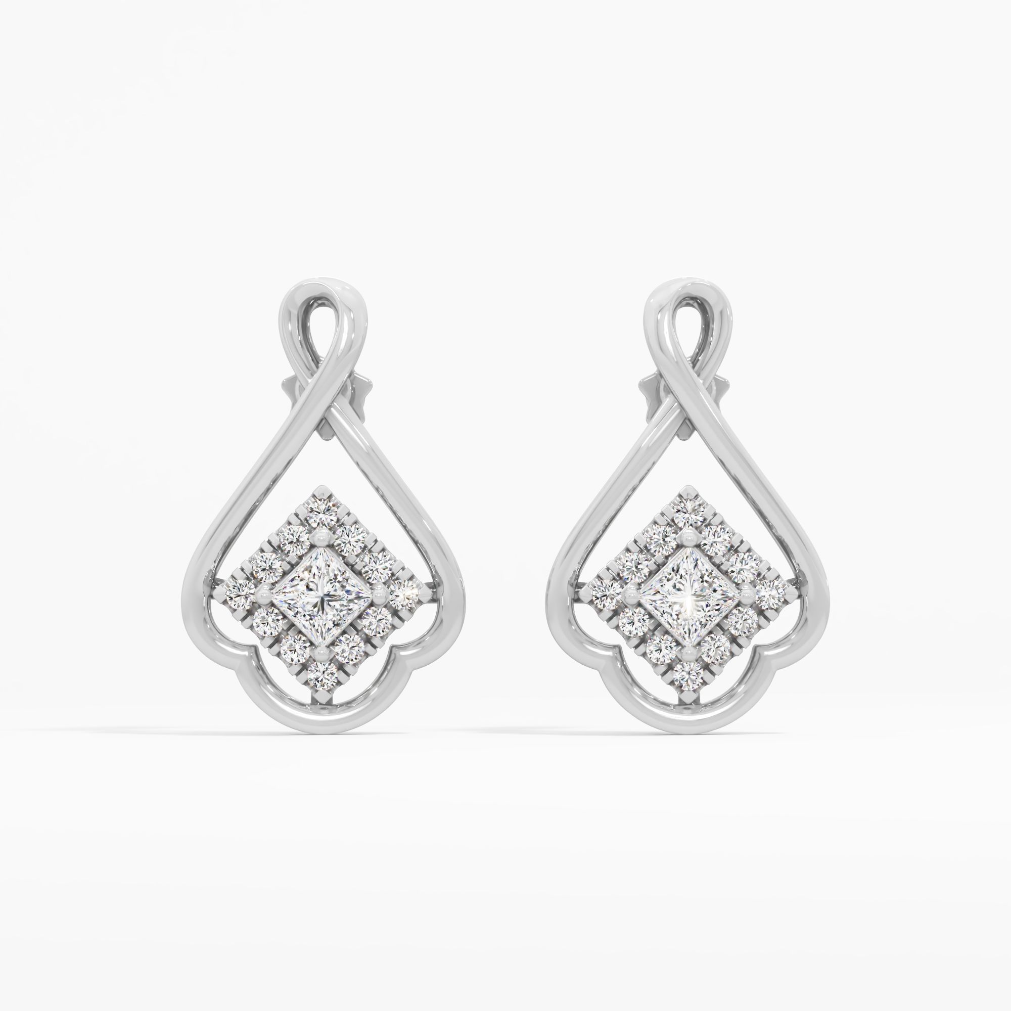 Elegant drop earrings showcasing a radiant princess-cut solitaire framed by a halo of round diamonds, forming a luminous knot-inspired design with refined sparkle and graceful move... Read More
