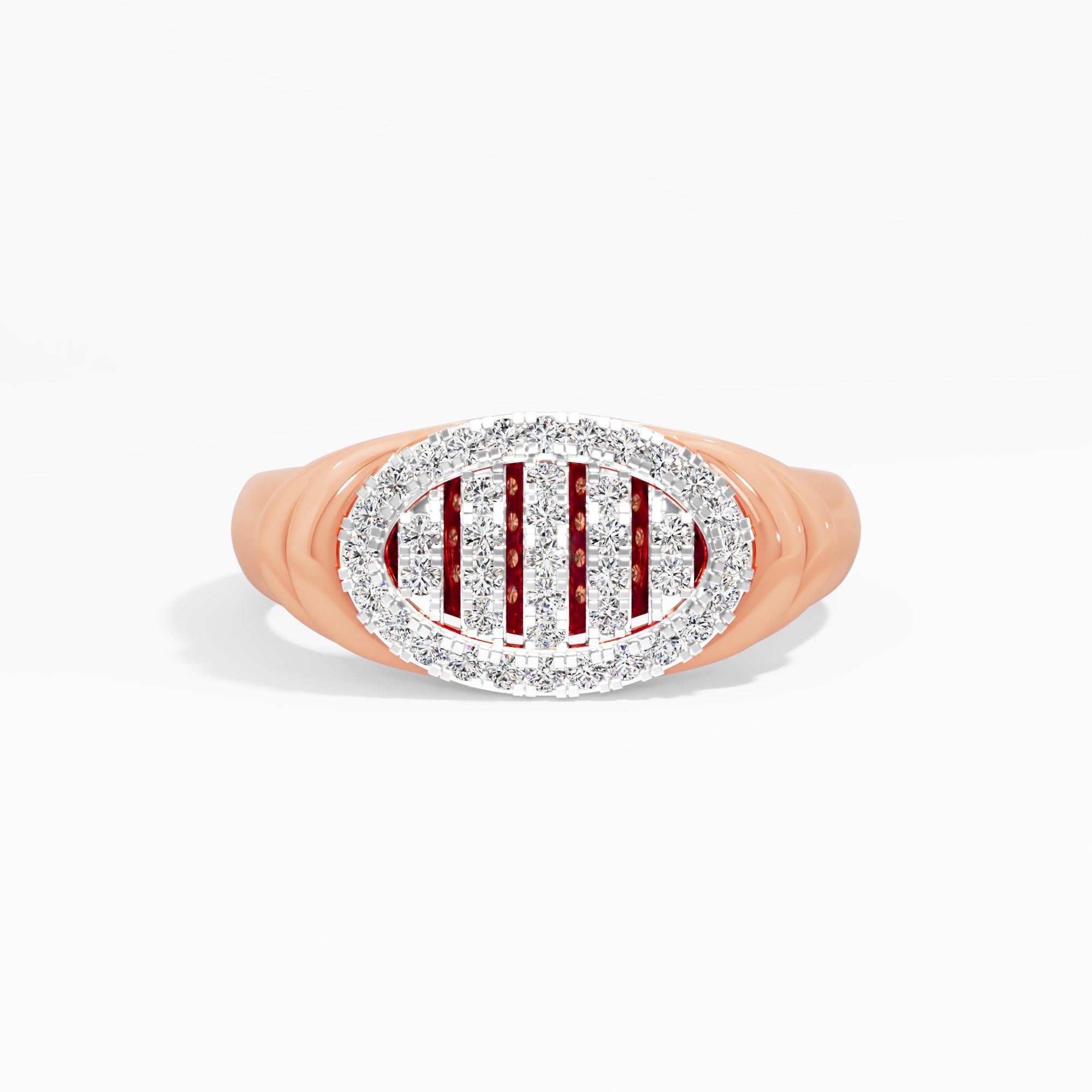 Parallel rays of round diamonds traverse the oval shaped illusion center lines of longitude. Framed by a halo, this design captures the essence of structured, vertical light in a b... Read More