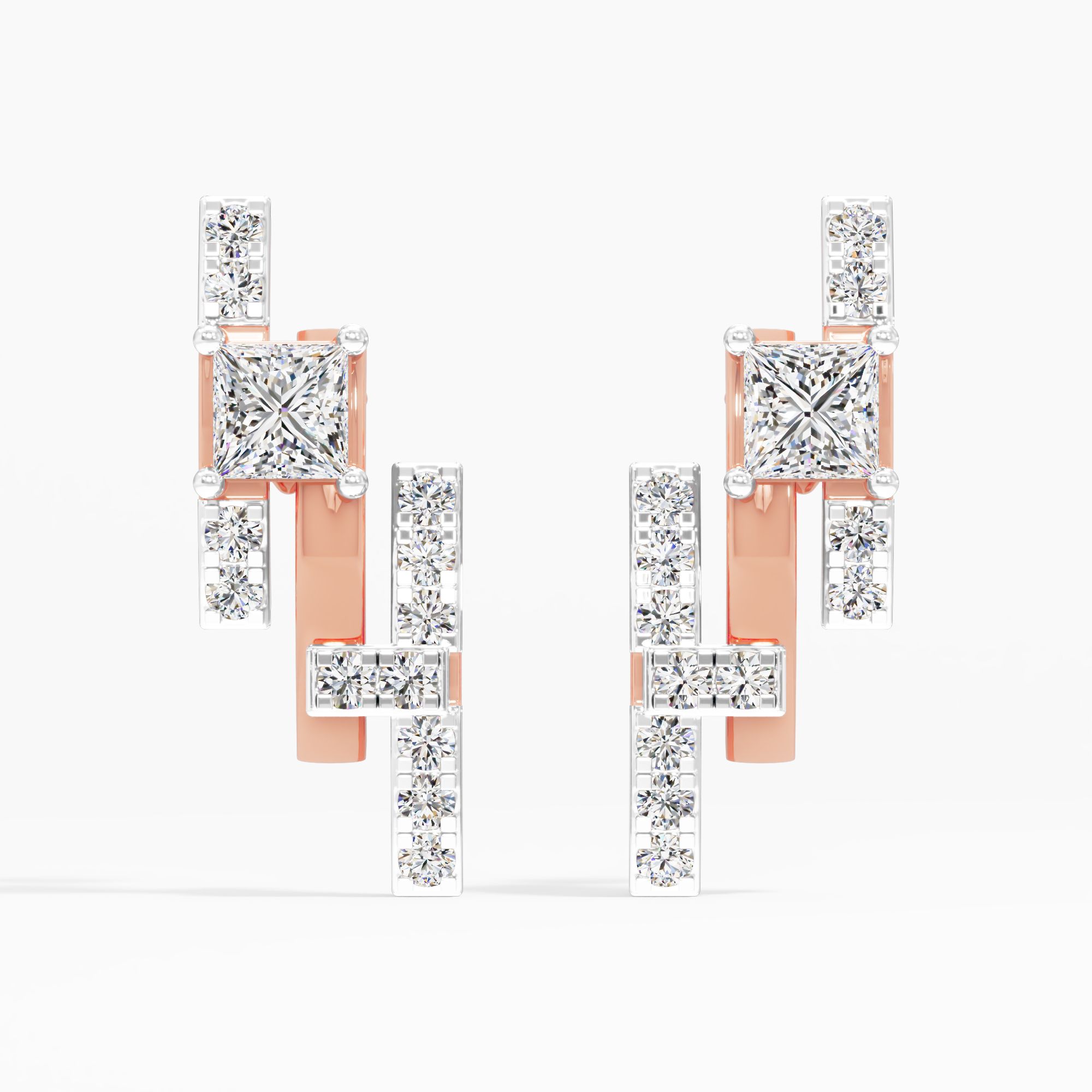 Urban-chic drops highlighting a princess-cut lab-grown diamond, flanked by uneven rising towers of paving stones that mimic a shimmering city horizon creating a bold architectural ... Read More