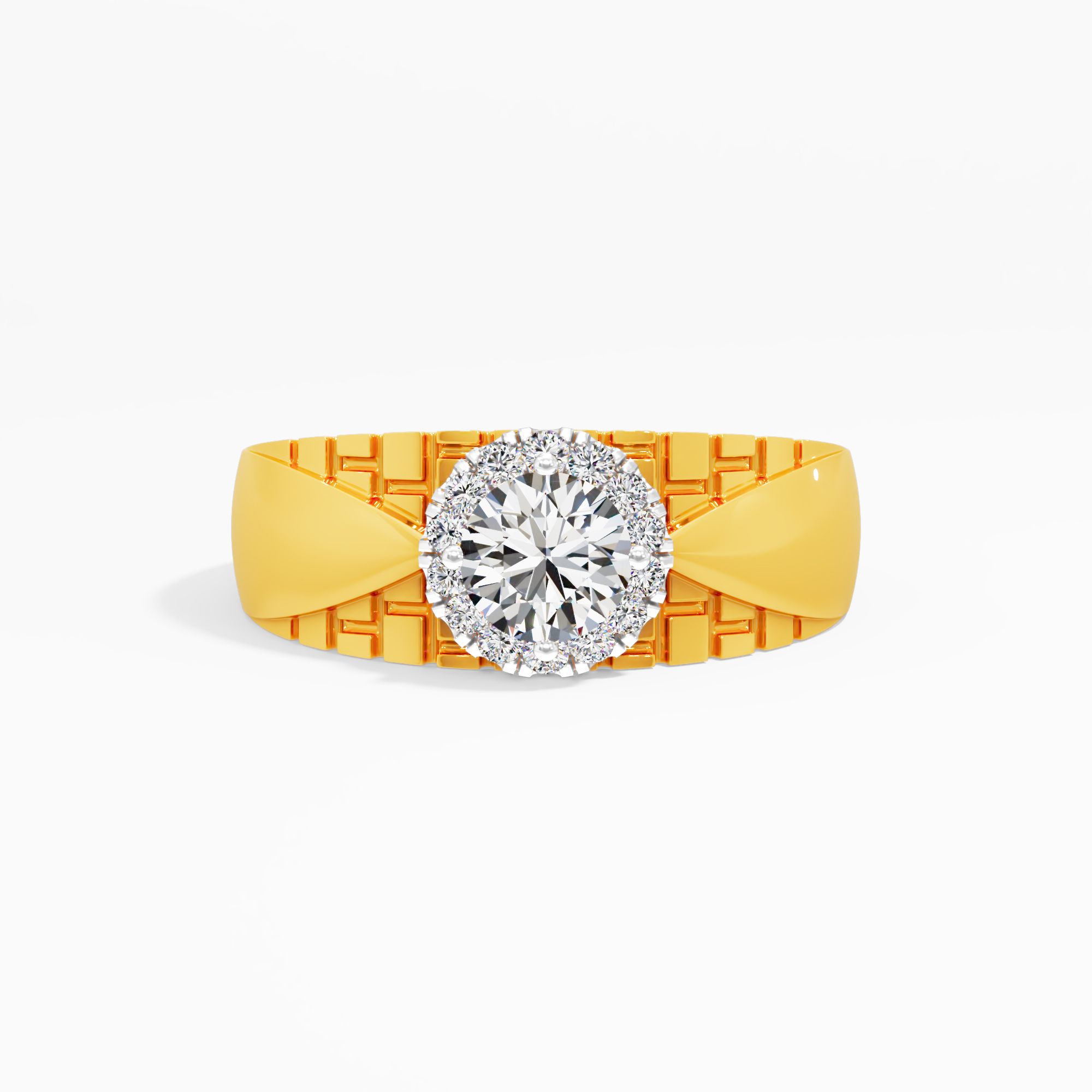A brilliant round solitaire is encircled by a round diamond halo in this ladies couple ring. Featuring a wide, architectural geometric band, this ring offers a bold, regal, and uni... Read More