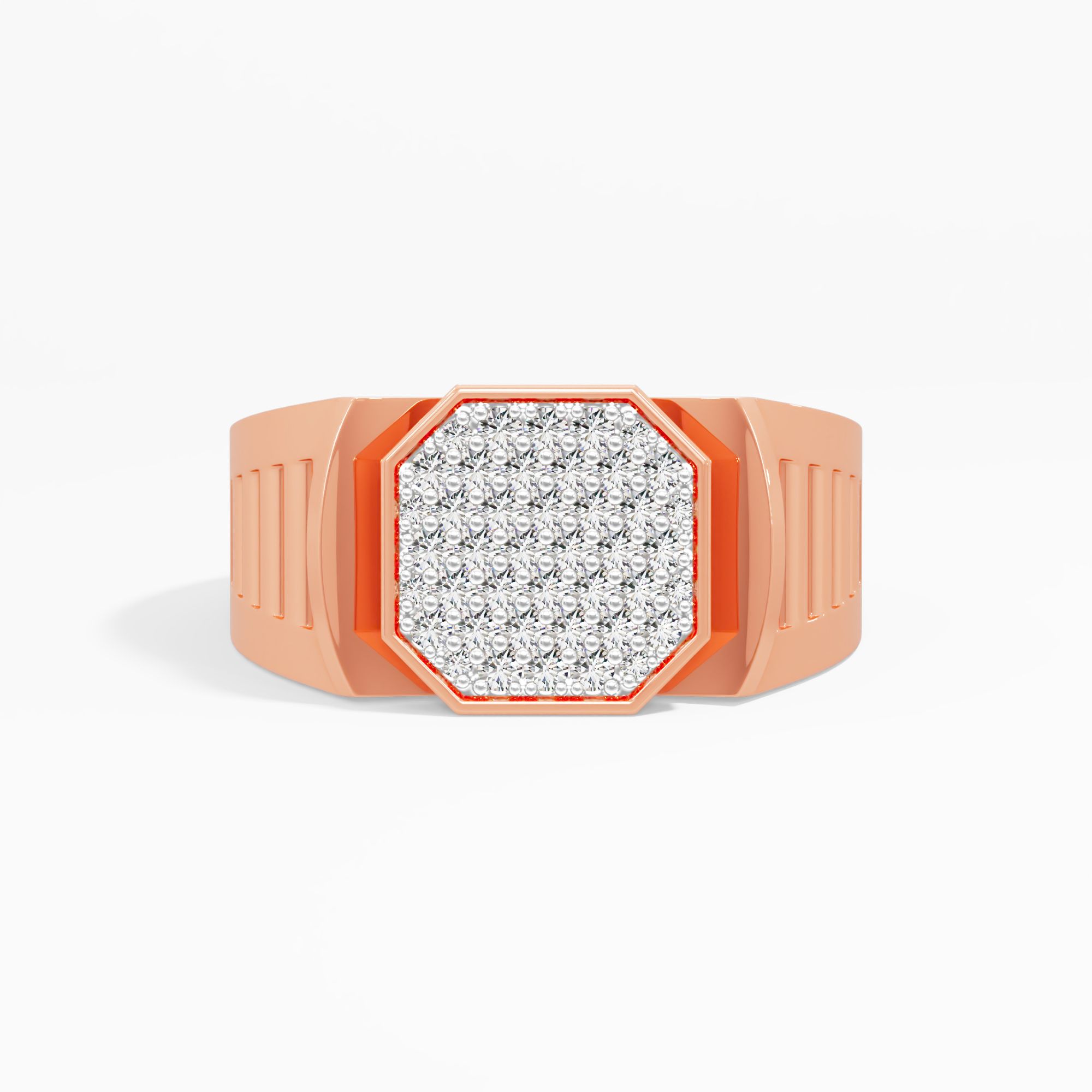 Deep horizontal grooves line the heavy shank, leading to a sparkling octagonal cluster of round diamonds. A bold, structured choice for the modern gentleman.