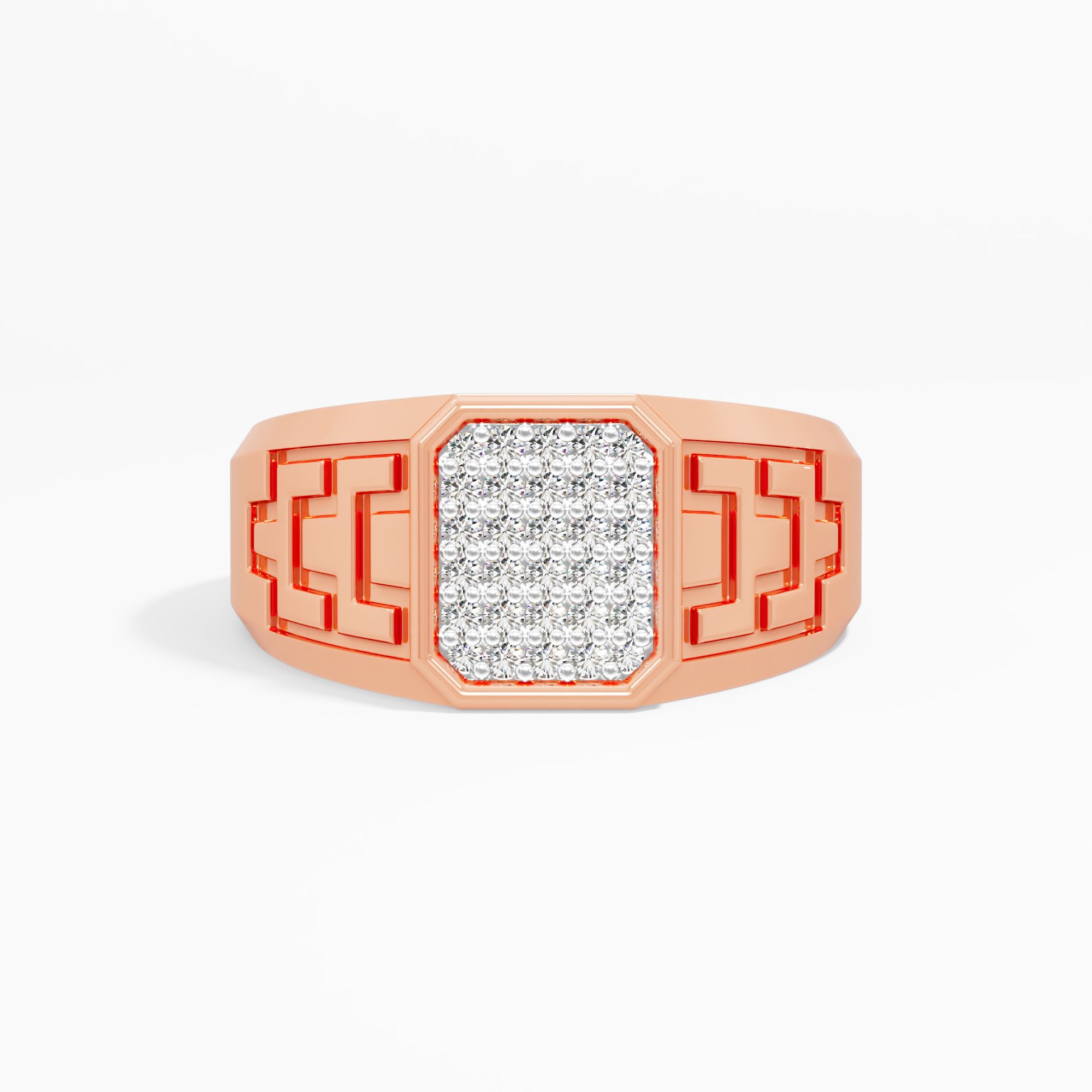 Deep geometric reliefs carved into the shank suggest infinite strength. An square cluster of round diamonds tops this heavy, architectural piece for a commanding look.