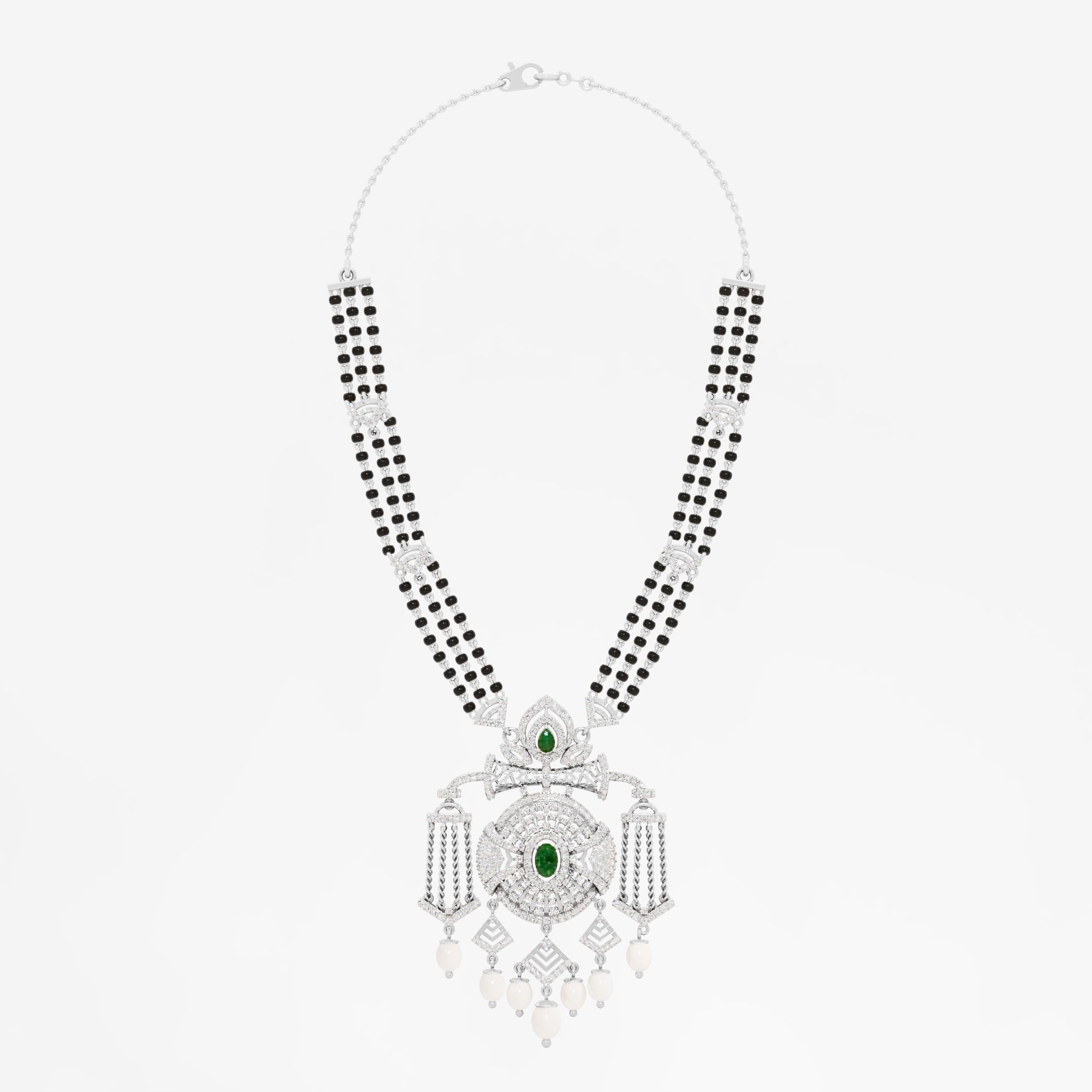 Diamond DetailsShape Round Color EF Clarity VVS Pieces 364 Total Weight 2.75 ct Gemstone DetailsShape Oval, Pear Color Green Clarity NA Pieces 9 Total Weight 3.20 ct Shape BEADS Color Black Clarity AAA Pieces 138 Total Weight 1.00 ct