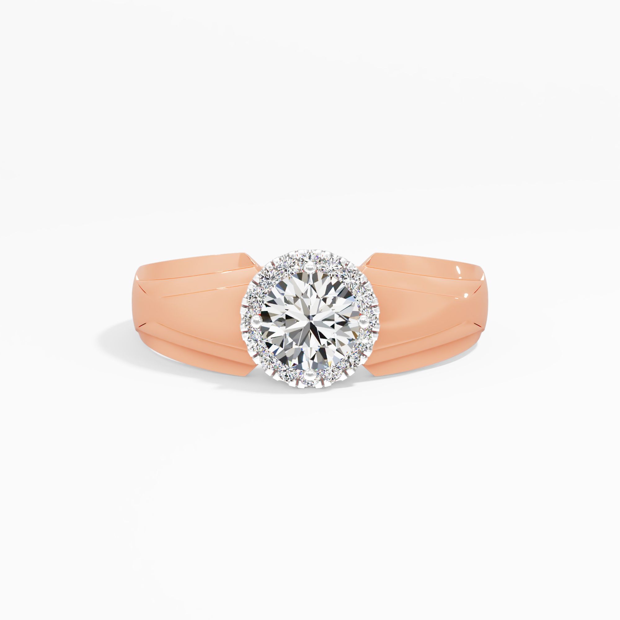 Elegant ladies ring featuring a round solitaire diamond framed by a delicate halo, paired with a softly contoured band that mirrors classic heritage styling with refined feminine b... Read More