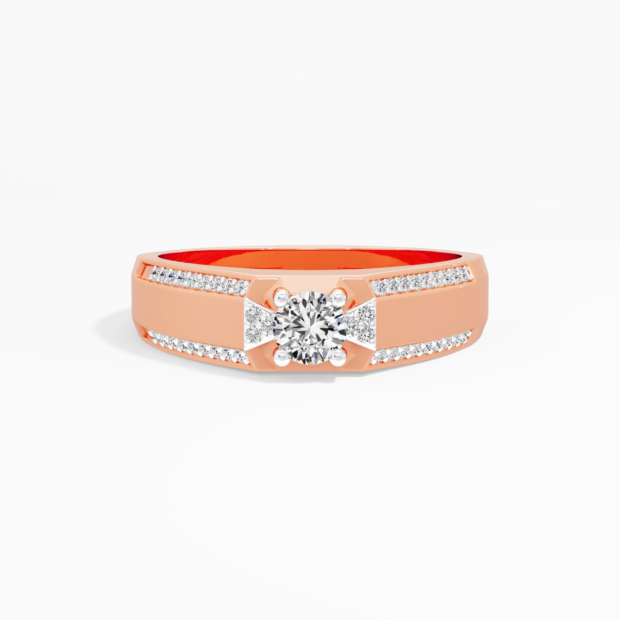 Distinctive triangular motifs frame a brilliant round center solitiare stone. Rows of shimmering round diamonds line the rails of this wide band, offering a dynamic and structured ... Read More
