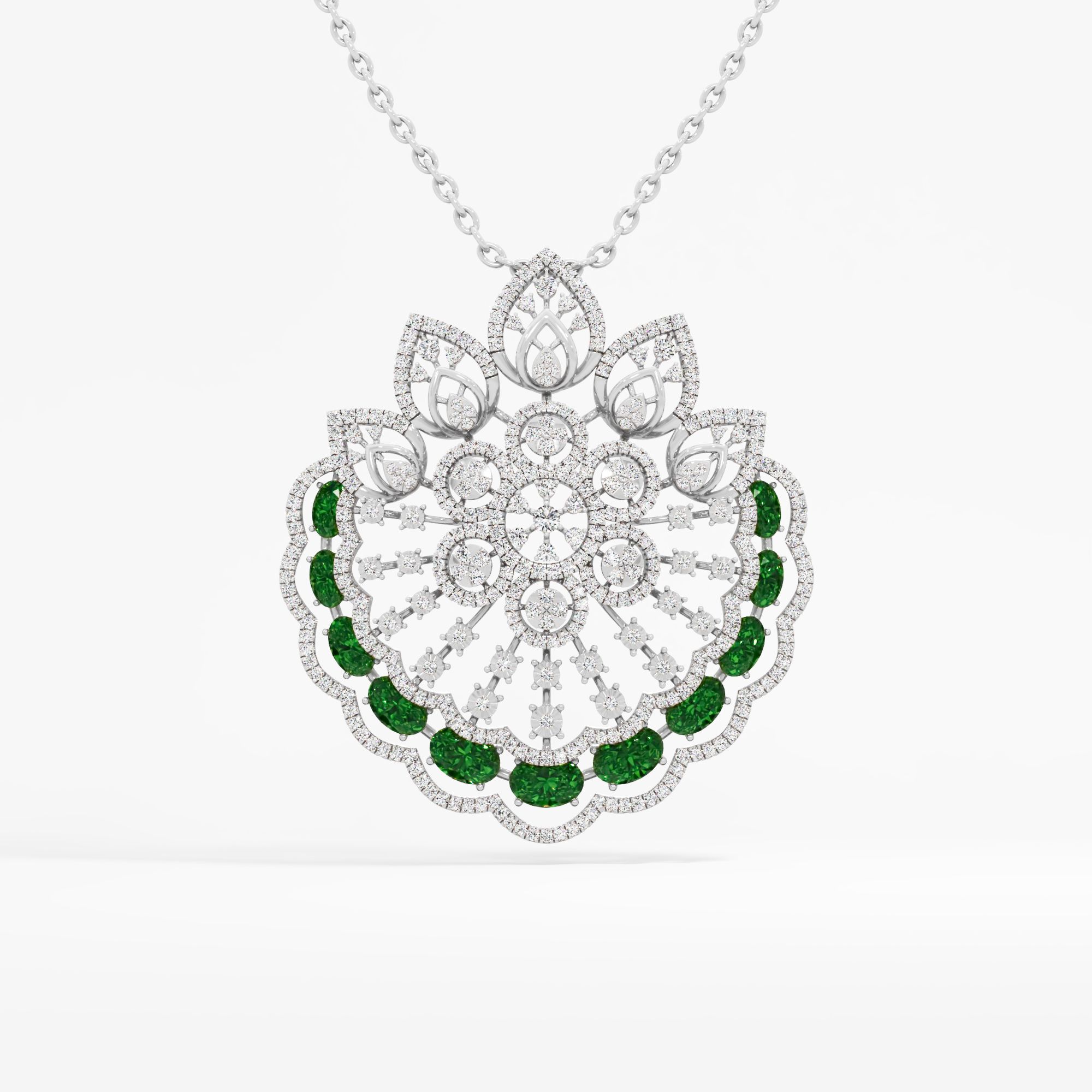 A blooming rosette of round lab-grown diamonds is fringed by deep green oval emeralds. This lacy, antique-inspired design pendant captures a uniquely vintage and romantic narrative... Read More