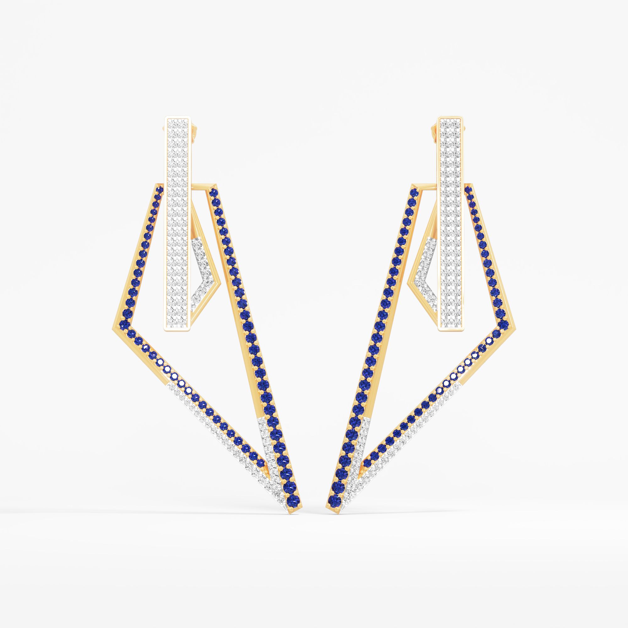 Radiating an ethereal glow, these geometric dangle earrings feature striking prismatic lines illuminated by brilliant round lab-grown diamonds and vibrant round blue gemstones for ... Read More