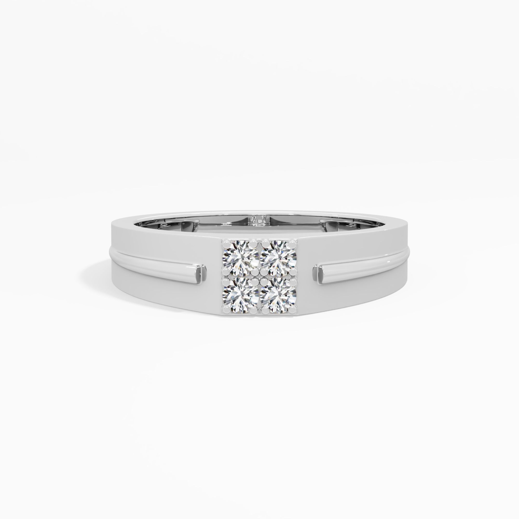 A strong gents ring featuring a square cluster of round diamonds center with two side white rhodium accents, adding contrast and a bold, confident modern look.