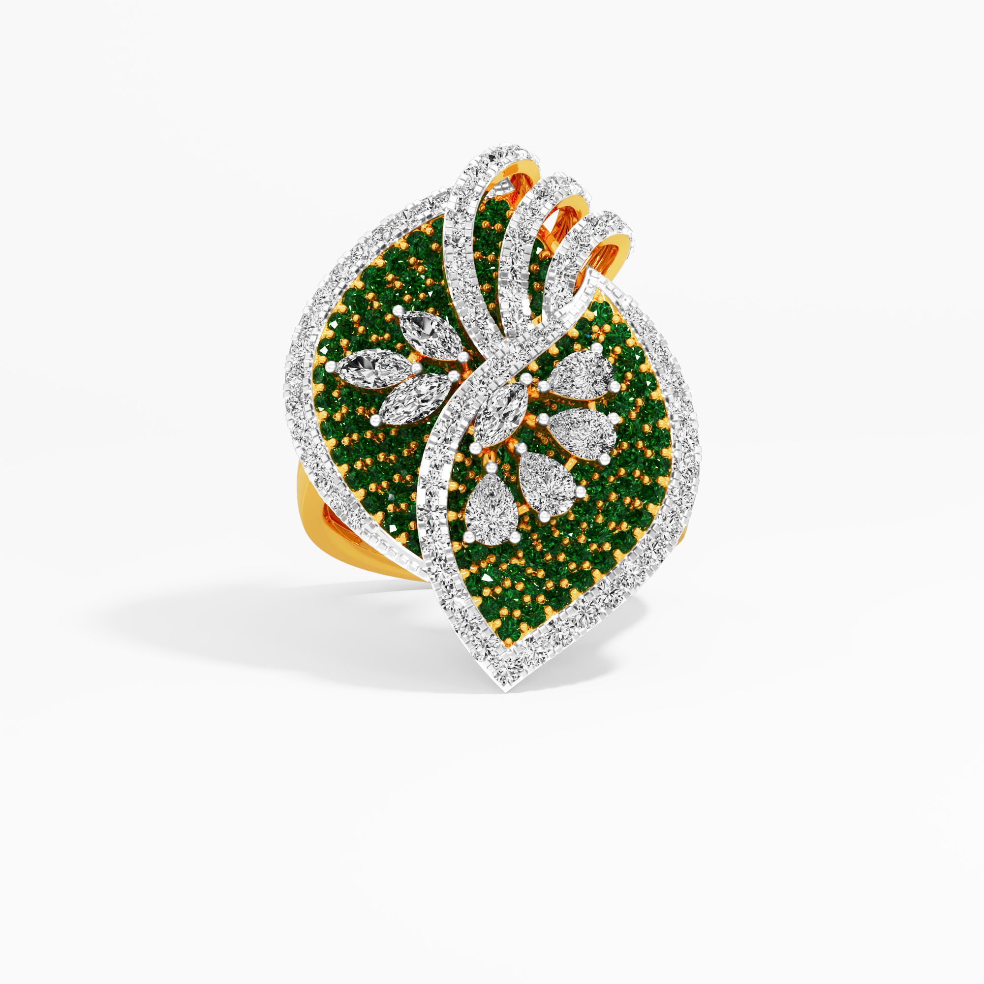 Capturing the freshness of a celestial morning, this rhythmic cocktail ring features a leaf-shaped veil of round green gemstones, accented by marquise, pear, and round lab-grown di... Read More