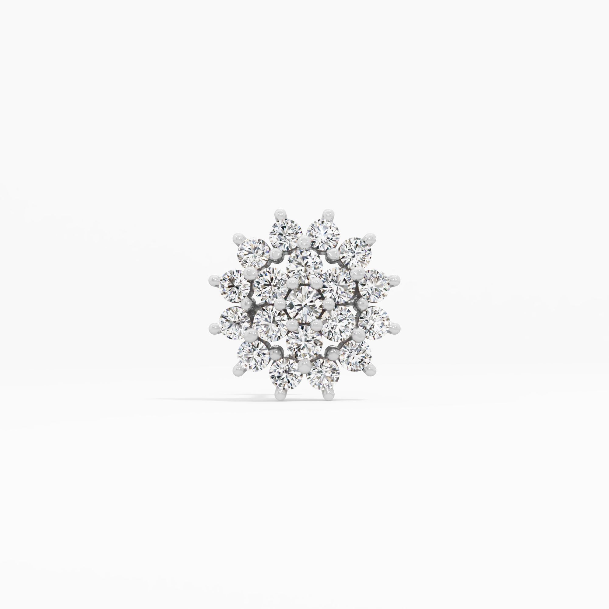 A magnificent statement piece. This nosepin features a central round diamond surrounded by a double halo of brilliant round diamonds, forming a spectacular, multi-layered starburst... Read More