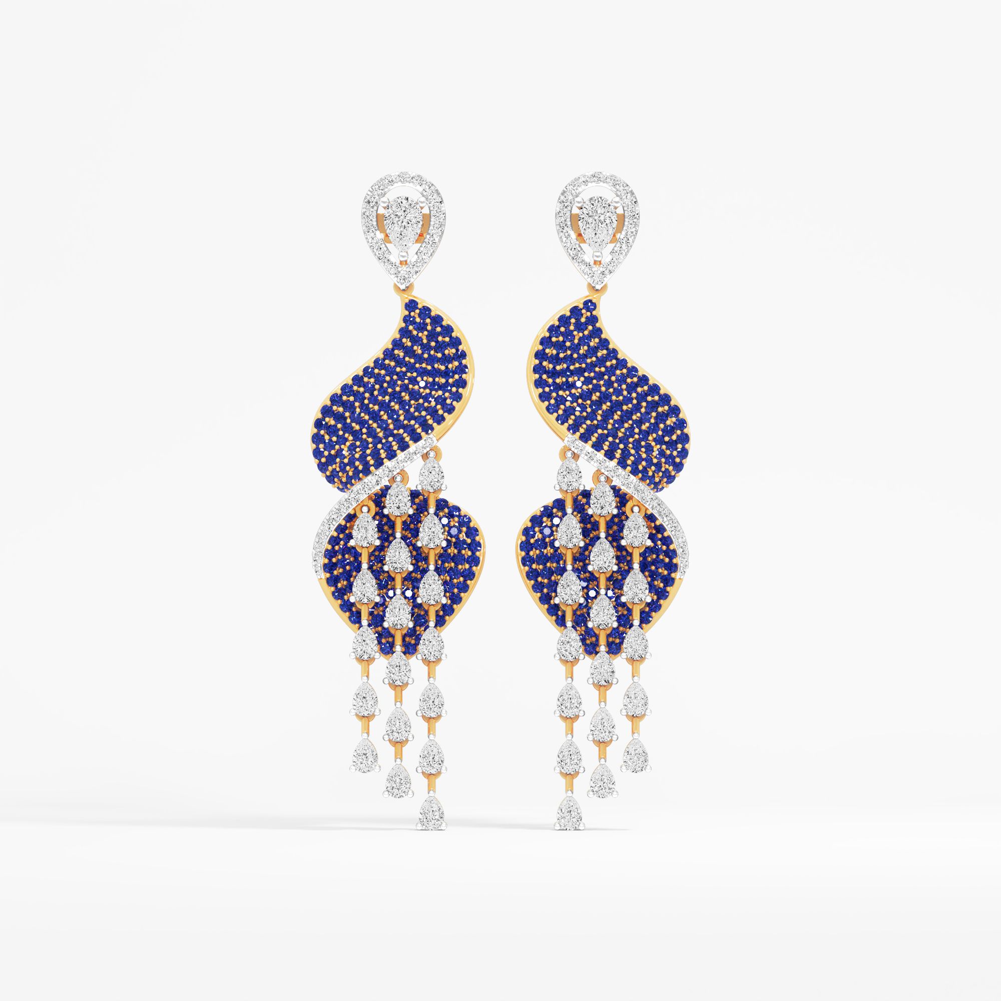Capturing the fluid motion of cosmic currents, these long dangle earrings feature a rhythmic wave of vibrant blue gemstones, beautifully accented by cascading pear-shaped lab-grown... Read More
