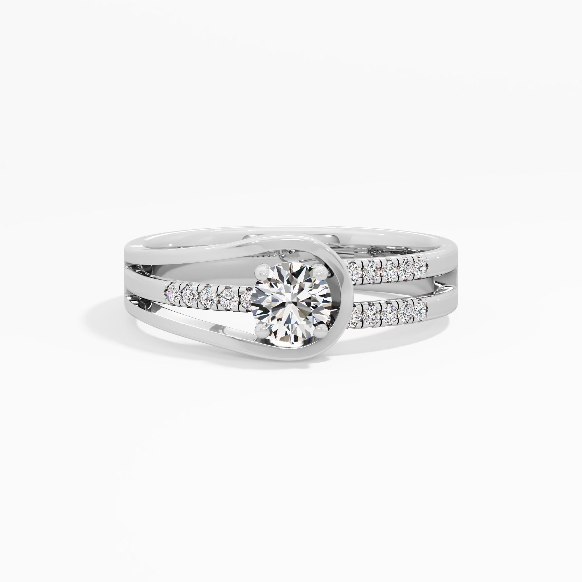 A brilliant round lab grown diamond center is cradled by a shimmering, looping bypass band for him. Accent round stones follow the curve, symbolizing a journey shared forever.