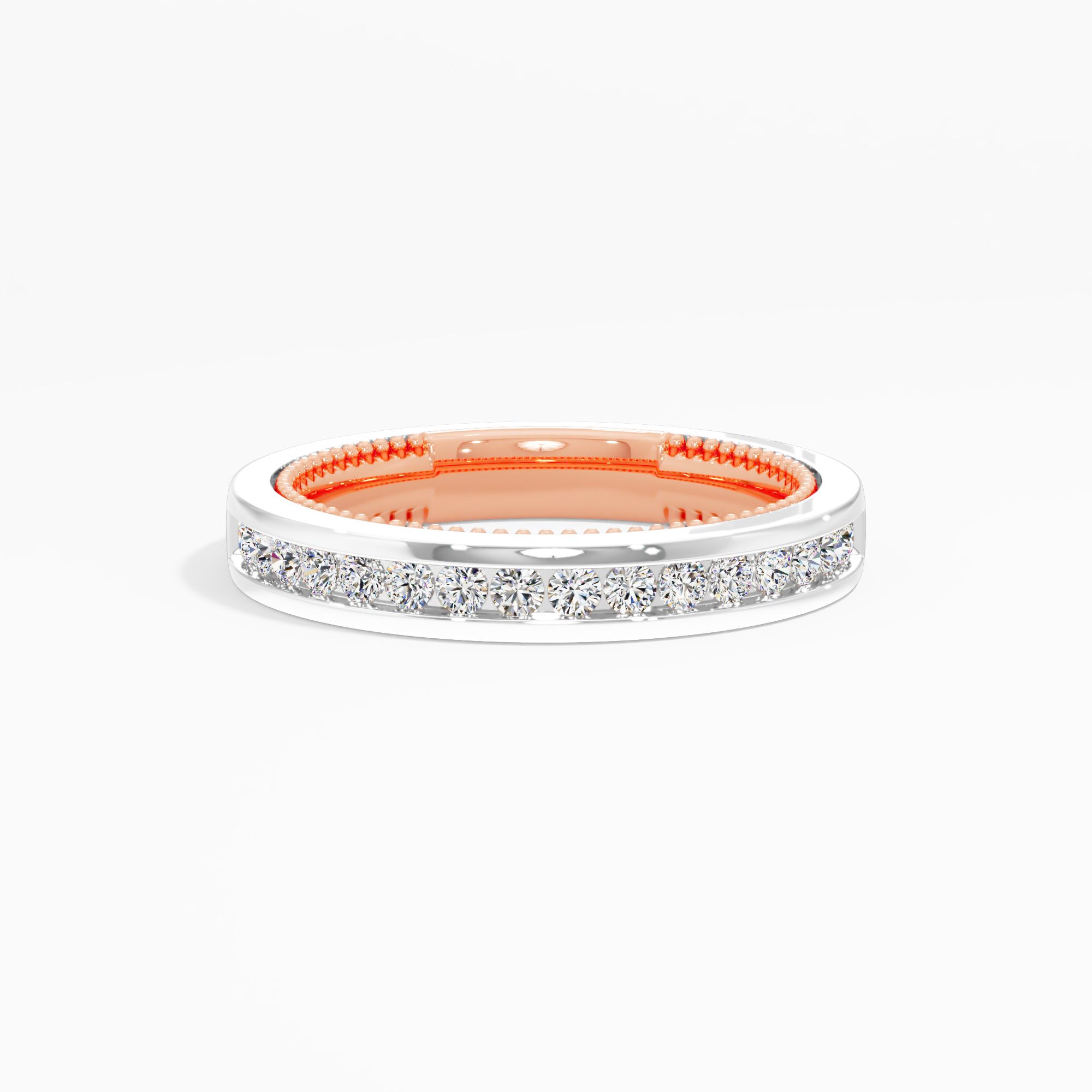 Radiant round lab grown diamonds are nestled in a sophisticated two tone channel band. A detailed beaded interior symbolizes the steady, hidden heartbeat of a beautiful, lifelong b... Read More