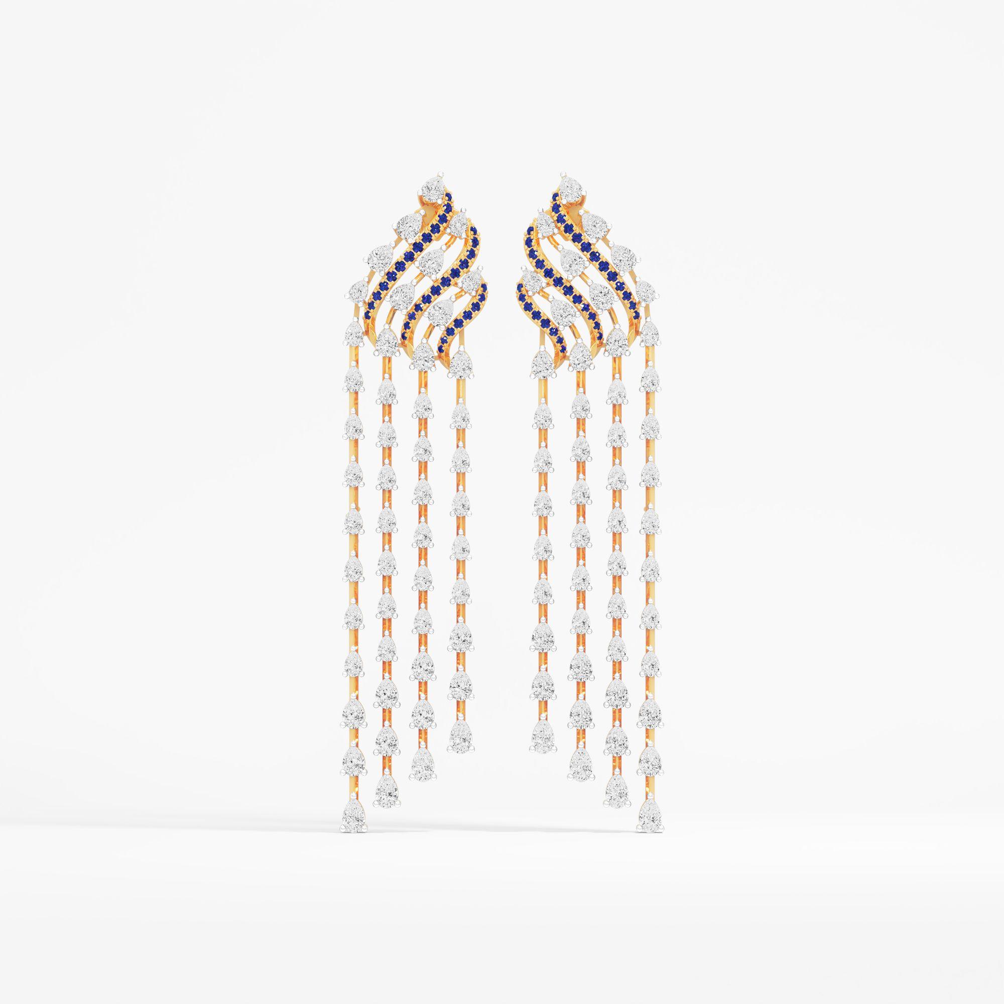 Capturing the mystery of an eternal night, these ornate dangle earrings feature a shimmering oval motif of round and pear lab-grown diamonds, beautifully centered by vibrant blue g... Read More