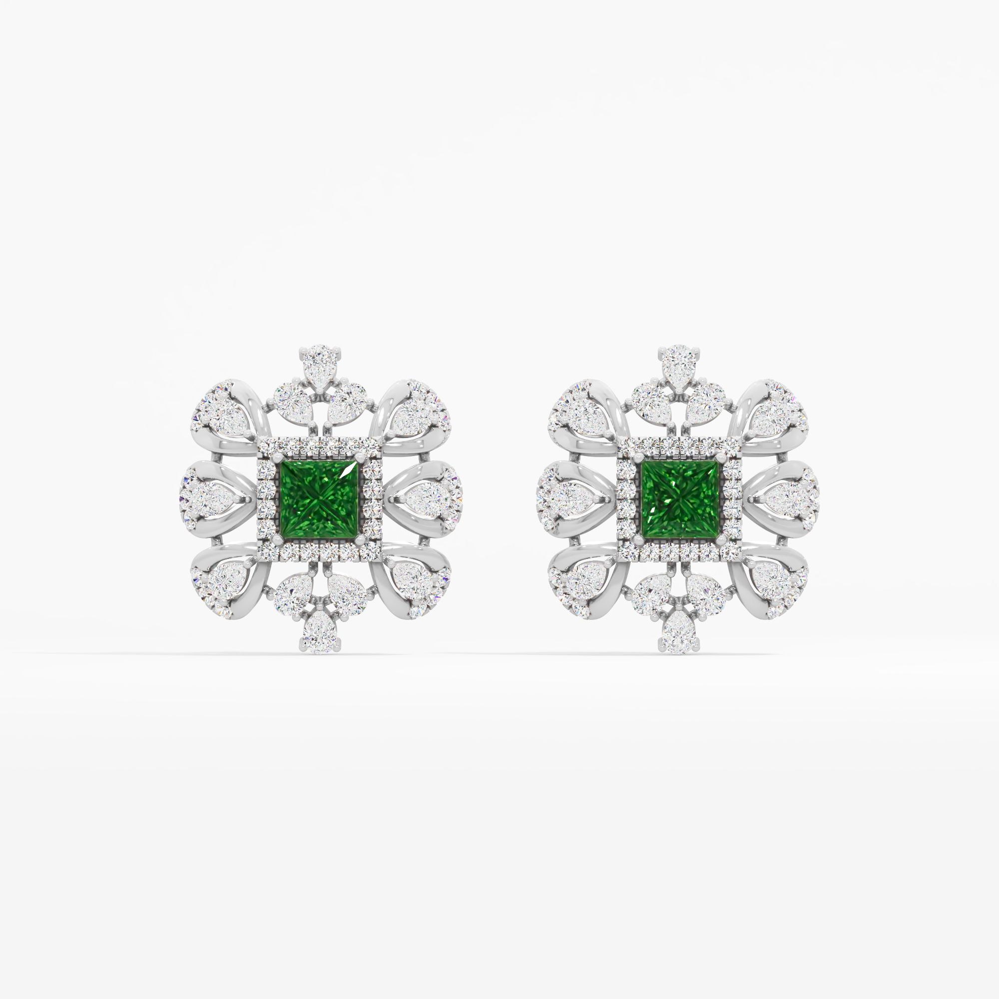 Stunning vintage studs featuring a princess cut emerald center in a round diamond halo, surrounded by an ornate openwork pattern set with pear and round lab-grown diamonds.