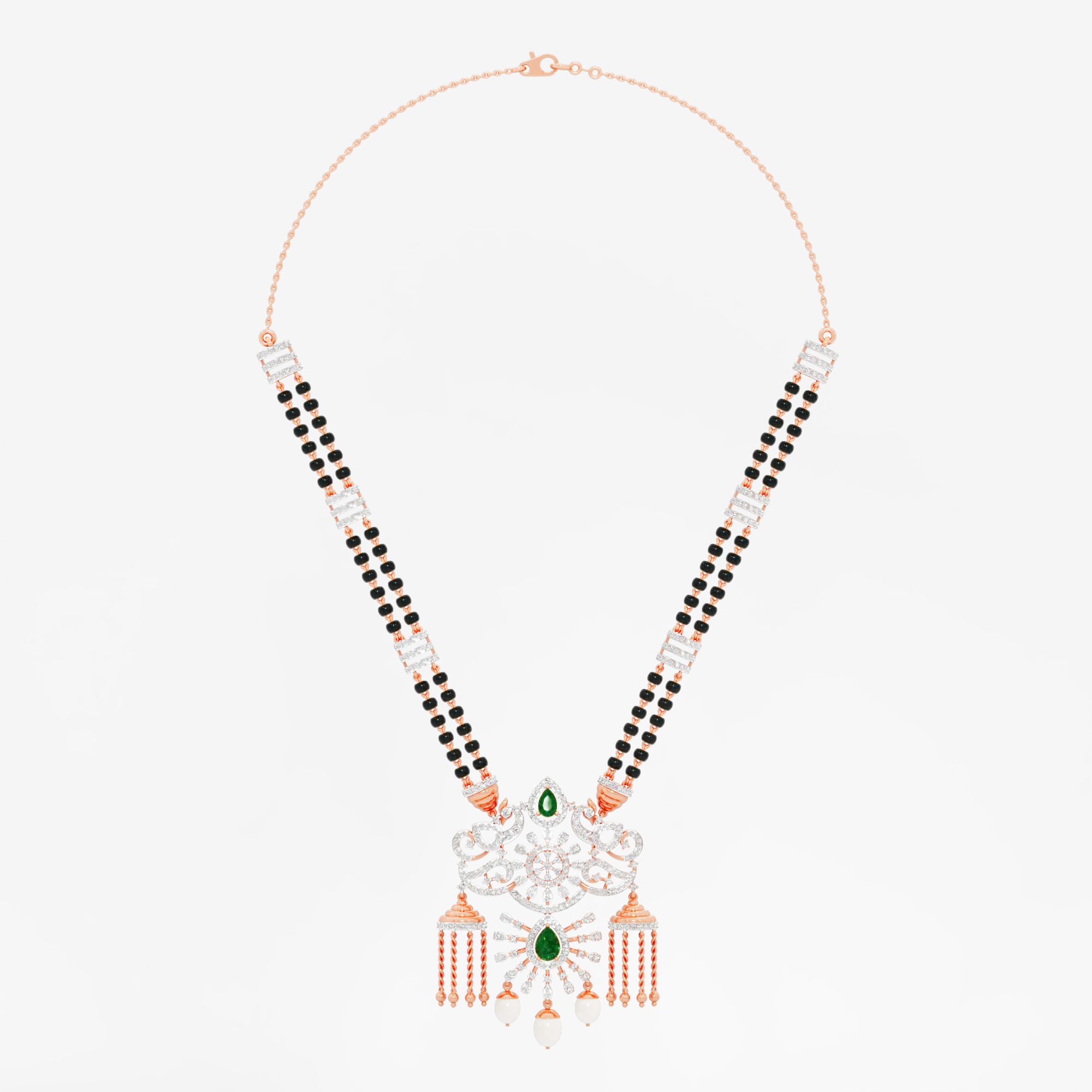 For the queen you are. A majestic mangalsutra featuring a cascade of lab-grown diamonds and royal green gems, designed for a truly grand entrance.
