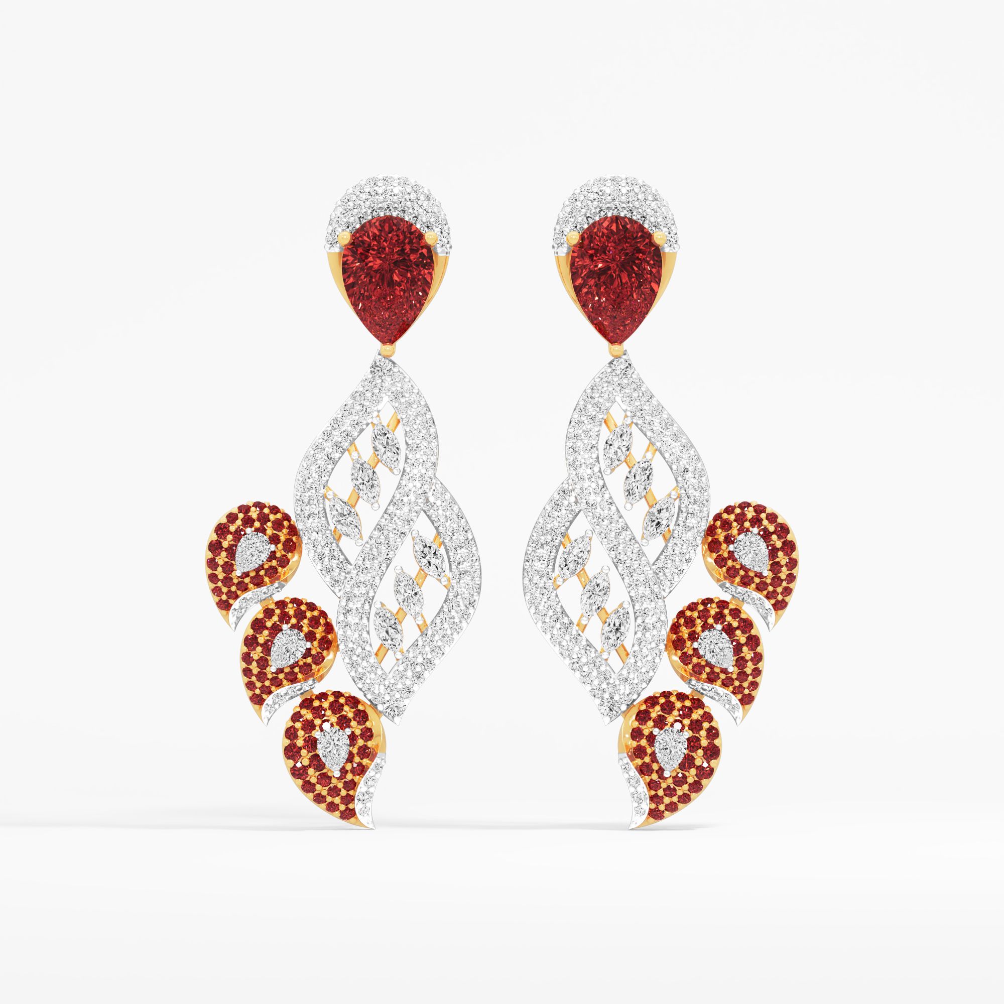 Inspired by nature’s shifting hues, these dangle earrings feature a luxurious scroll of round, pear, and marquise lab-grown diamonds dancing alongside brilliant round and pear red ... Read More