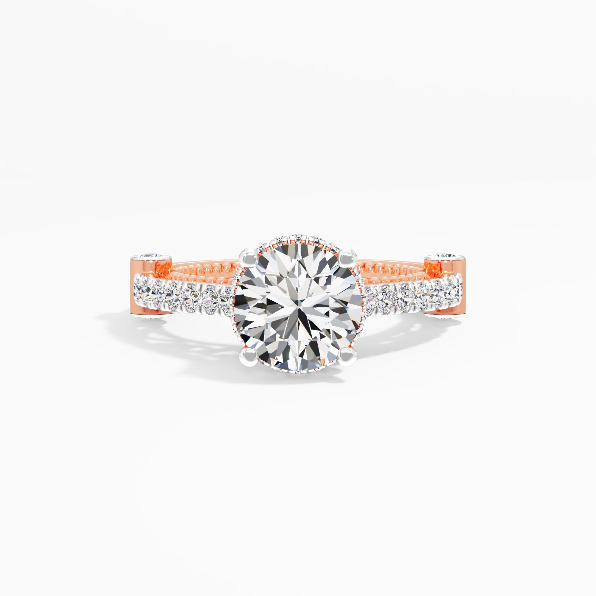 Shimmering round lab grown diamonds encircle a radiant solitaire round diamond in this vintage-inspired halo ring. Delicate milgrain detailing and an intricate gallery create a sop... Read More