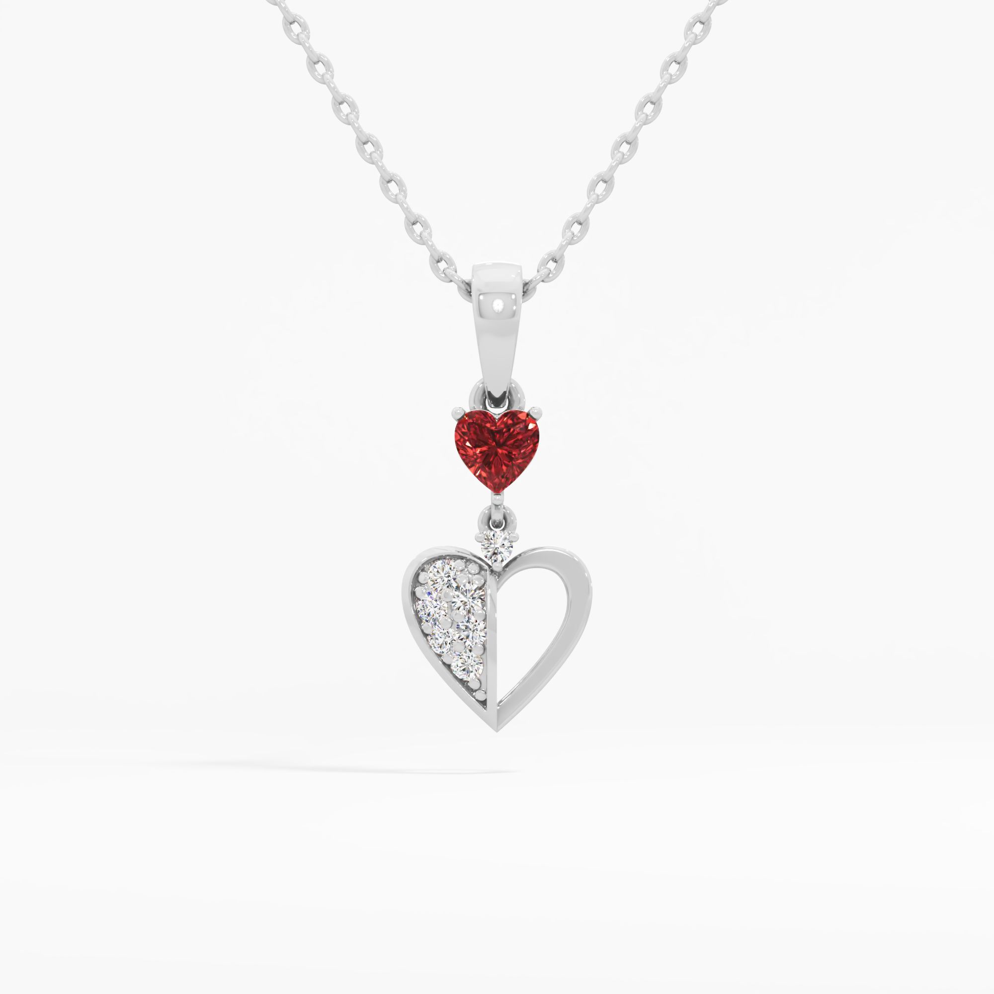 Crafted as a symbol of commitment, this split heart pendant highlights a heart-shaped ruby gemstone and shimmering round diamonds, telling a story of devotion, balance, and lasting... Read More
