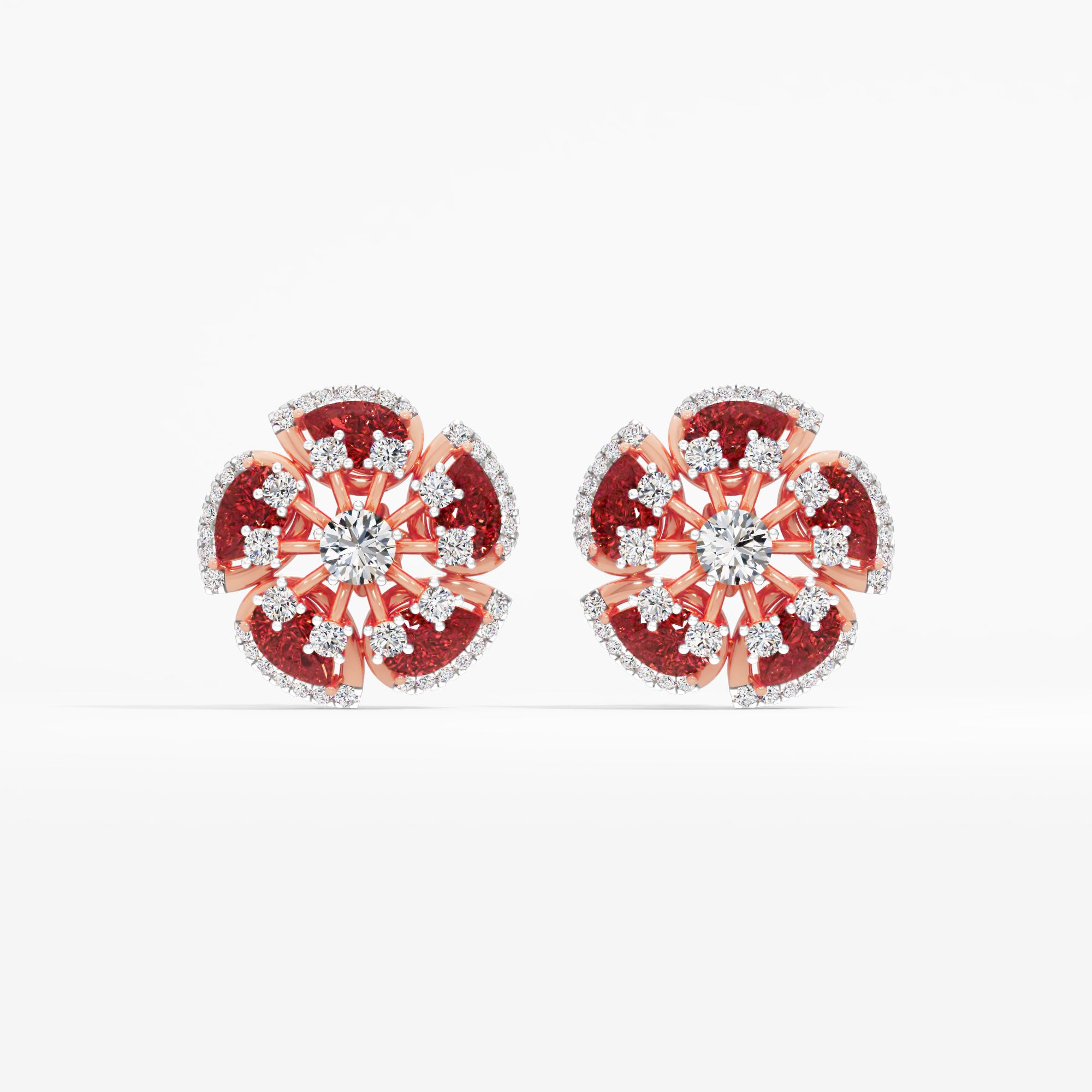 Radiant starburst studs featuring a round diamond center, surrounded by vibrant pear shaped red rubies and a sparkling border of round lab-grown diamonds for a dazzling, luxurious ... Read More