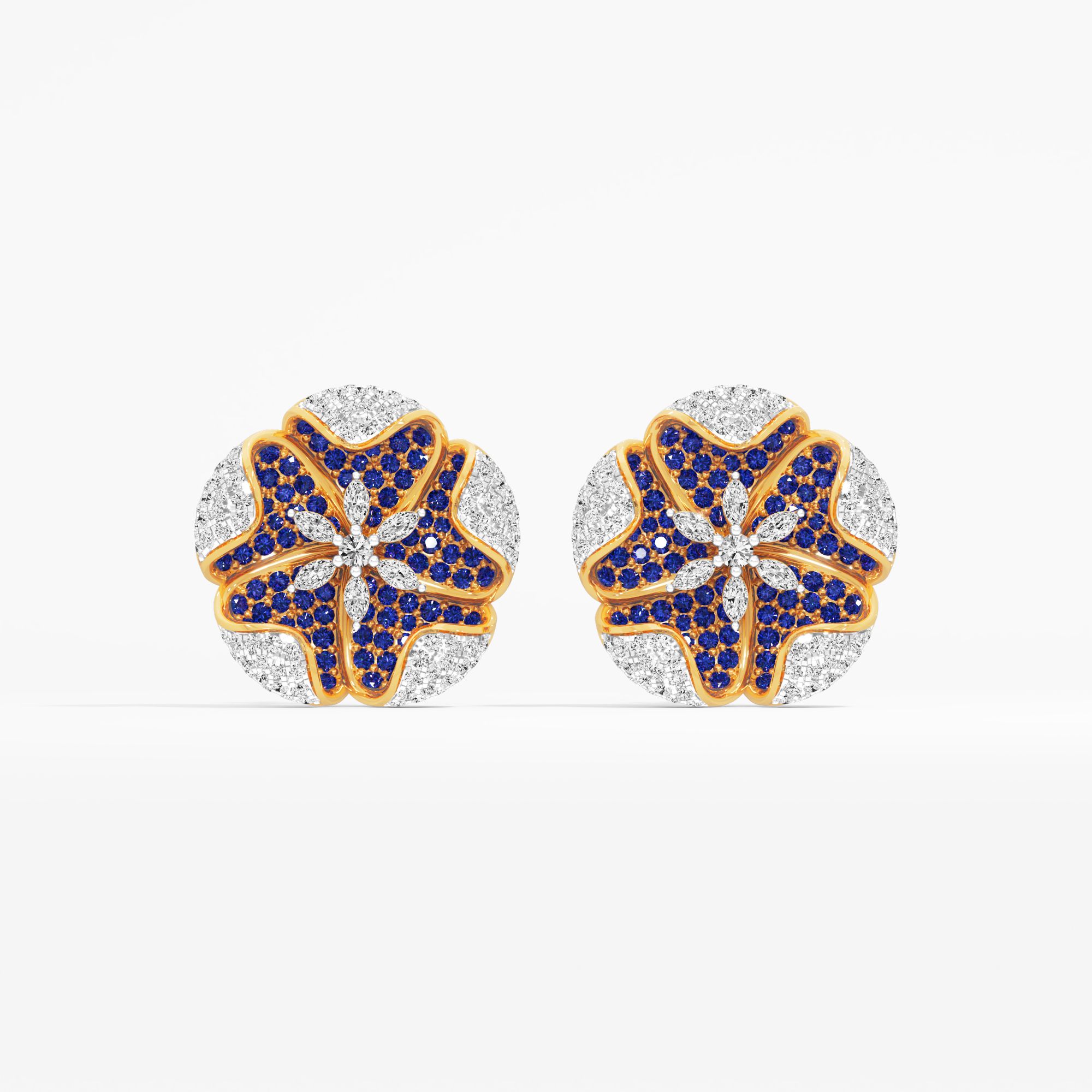 Embodying ethereal elegance, these stud earrings showcase a stellar floral motif of marquise and round lab-grown diamonds set against a brilliant, shimmering blue gemstone aurora v... Read More