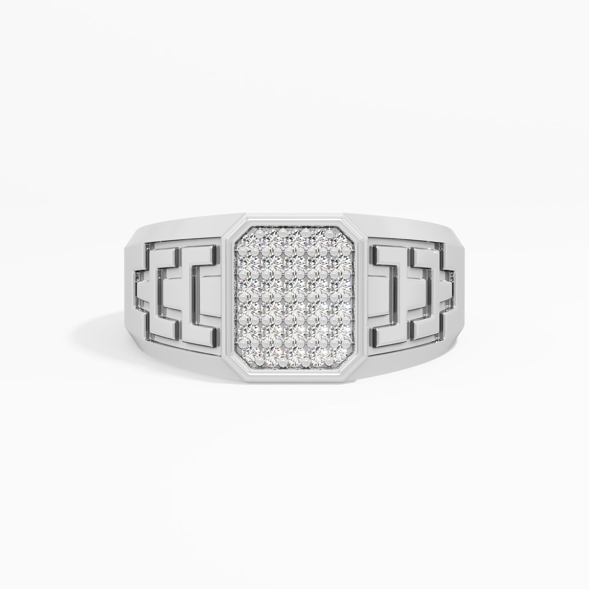 Deep geometric reliefs carved into the shank suggest infinite strength. An square cluster of round diamonds tops this heavy, architectural piece for a commanding look.