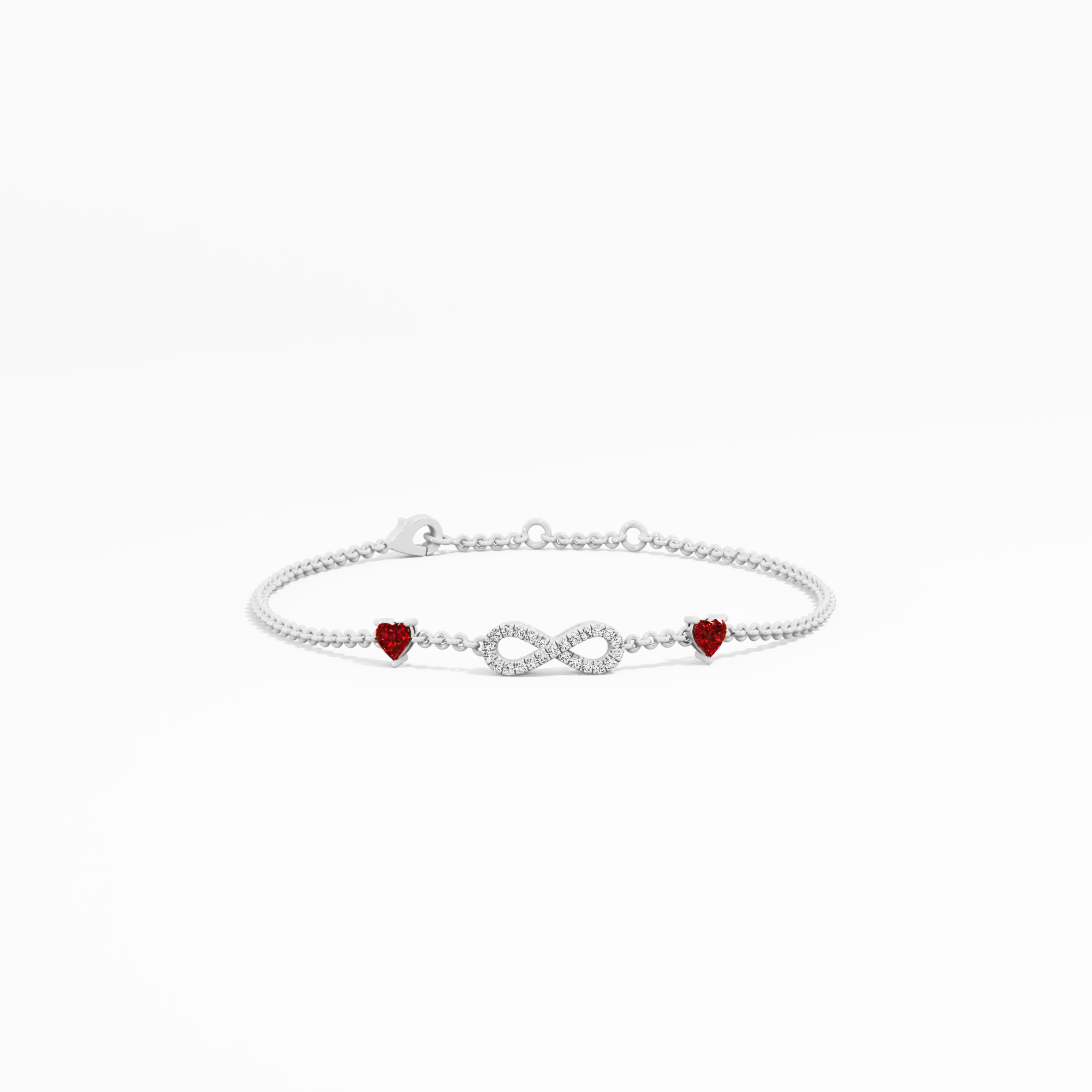Symbolizing endless passion, this bracelet showcases a sparkling infinity motif paved with round diamonds. It is beautifully accented by two vibrant, heart-shaped red gemstones on ... Read More
